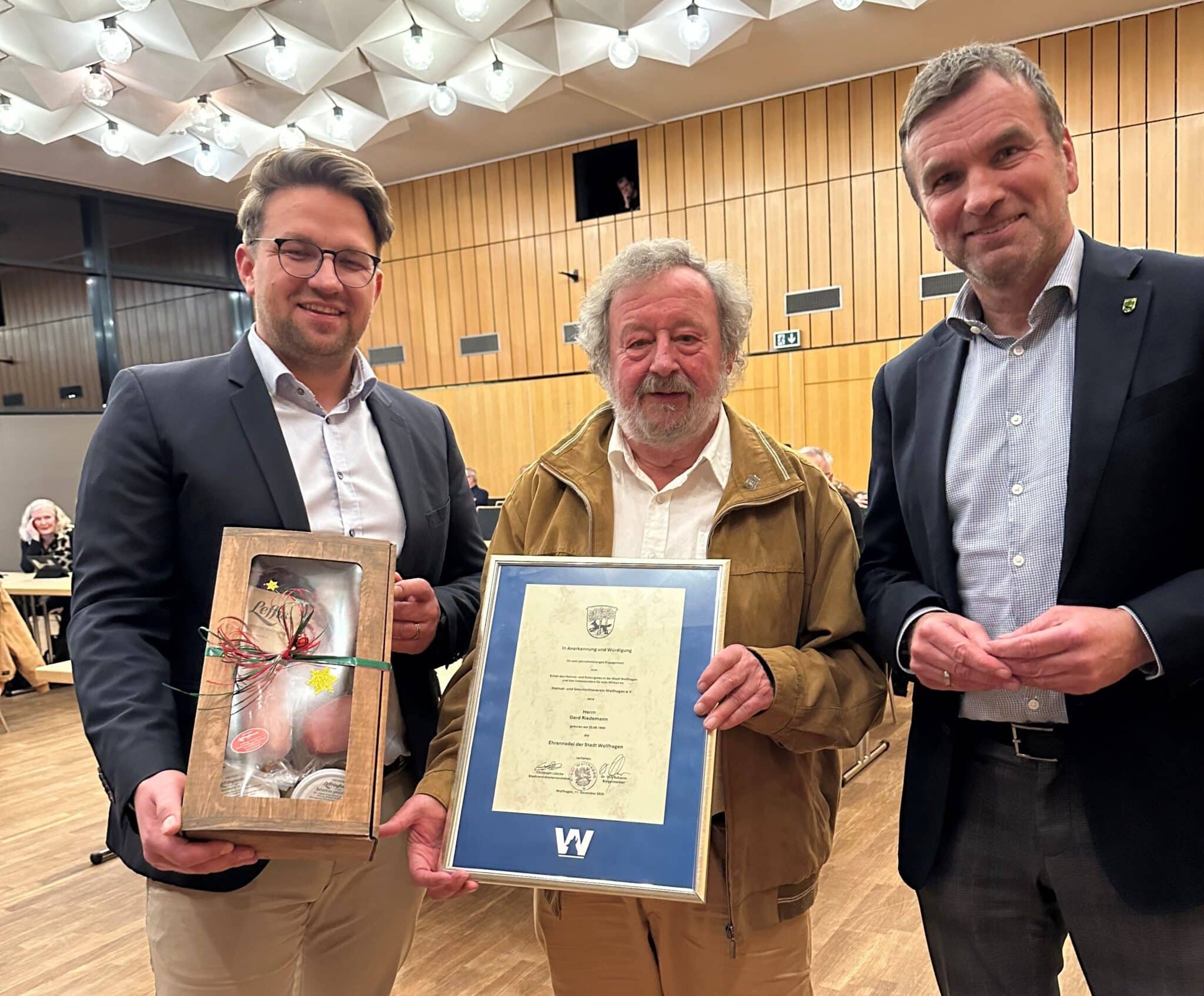 Eine besondere Auszeichnung wurde dem Wolfhager Bürger Gerd Riedemann im Rahmen der vergangenen Sitzung der Stadtverordnetenversammlung am 11.12.2025 in der Stadthalle zuteil: Stadtverordnetenvorsteher Christoph Lübcke sowie Bürgermeister Dirk Scharrer überreichten ihm die Ehrennadel der Stadt Wolfhagen. Sie ehrten Riedemann, der auch bereits den Ehrenbrief des Landes Hessen erhalten hatte, damit aufgrund seiner jahrzehntelangen Aktivitäten im Vorstand des Heimat- und Geschichtsvereines, zu der auch die wichtige Aufgabe des Schatzmeisters gehört. Heimatverbunden, zuverlässig, beharrlich und sehr kreativ, wenn es darum geht, neue Ideen zu entwickeln, um die Historie der Stadt lebendig zu halten, so beschrieb Bürgermeister Dirk Scharrer den Wolfhager in seiner emotionalen Laudatio und ergänzte beispielhaft das herausragende Wirken Riedemanns: „Insbesondere das gelungene Stadt-Relief auf dem Marktplatz ist maßgeblich ihm zu verdanken.“