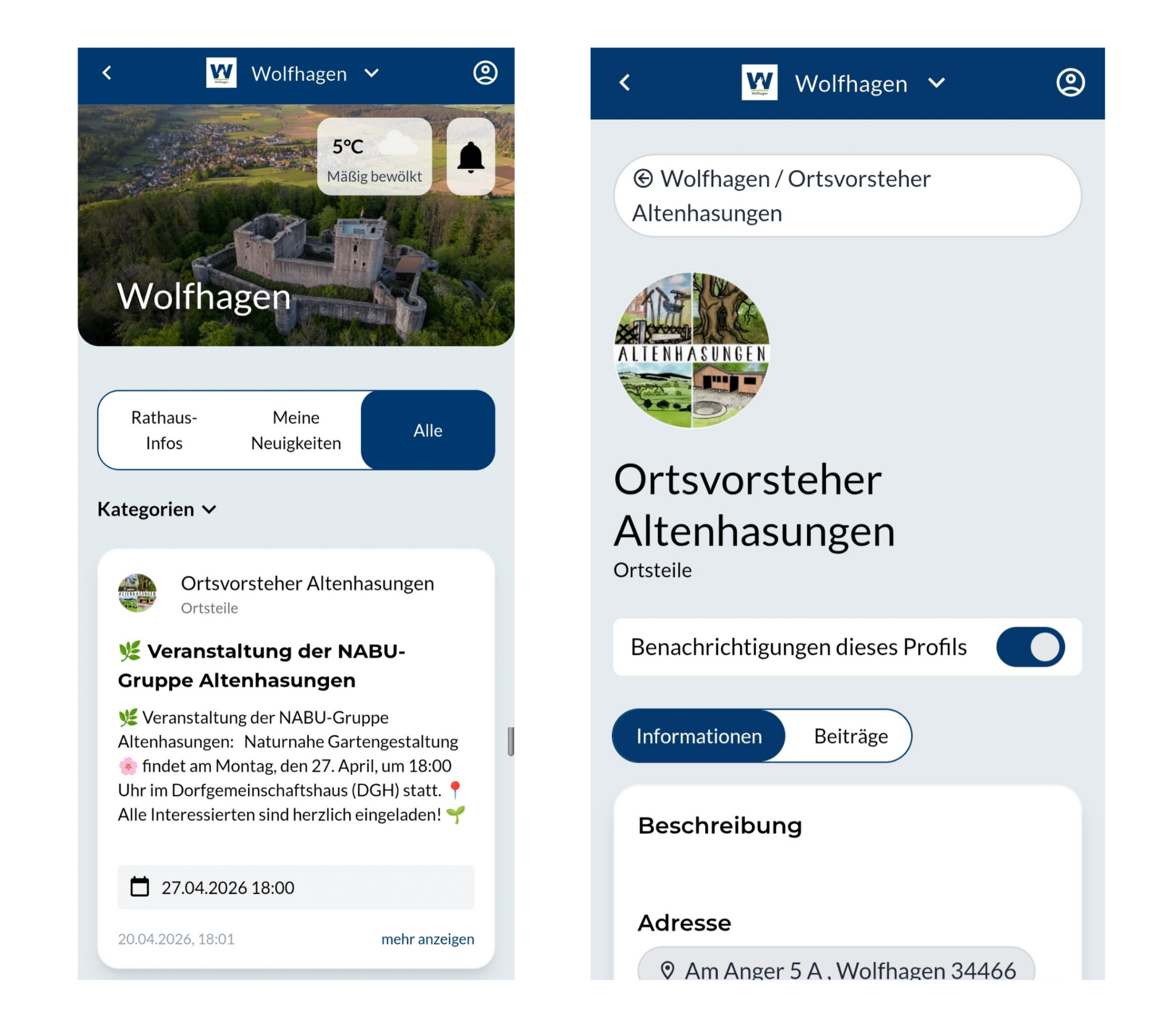 Es ist so weit: Das Update der Wolfhagen-App beinhaltet eine Reihe an neuen Funktionen, die unter anderem Vereinen und Ortsbeiräten dabei helfen, ihre Öffentlichkeitsarbeit noch effektiver zu gestalten. So können in der Wolfhagen App ab sofort gemeinsam alle Informationen auf einer einzigen Plattform veröffentlicht werden: Wo vorher nur aktuelle Meldungen aus dem Rathaus nachzulesen waren, können nun auch Vereinsvorstände und Ortsvorsteher eigenständig Veranstaltungen, Informationen und Neuigkeiten veröffentlichen.
