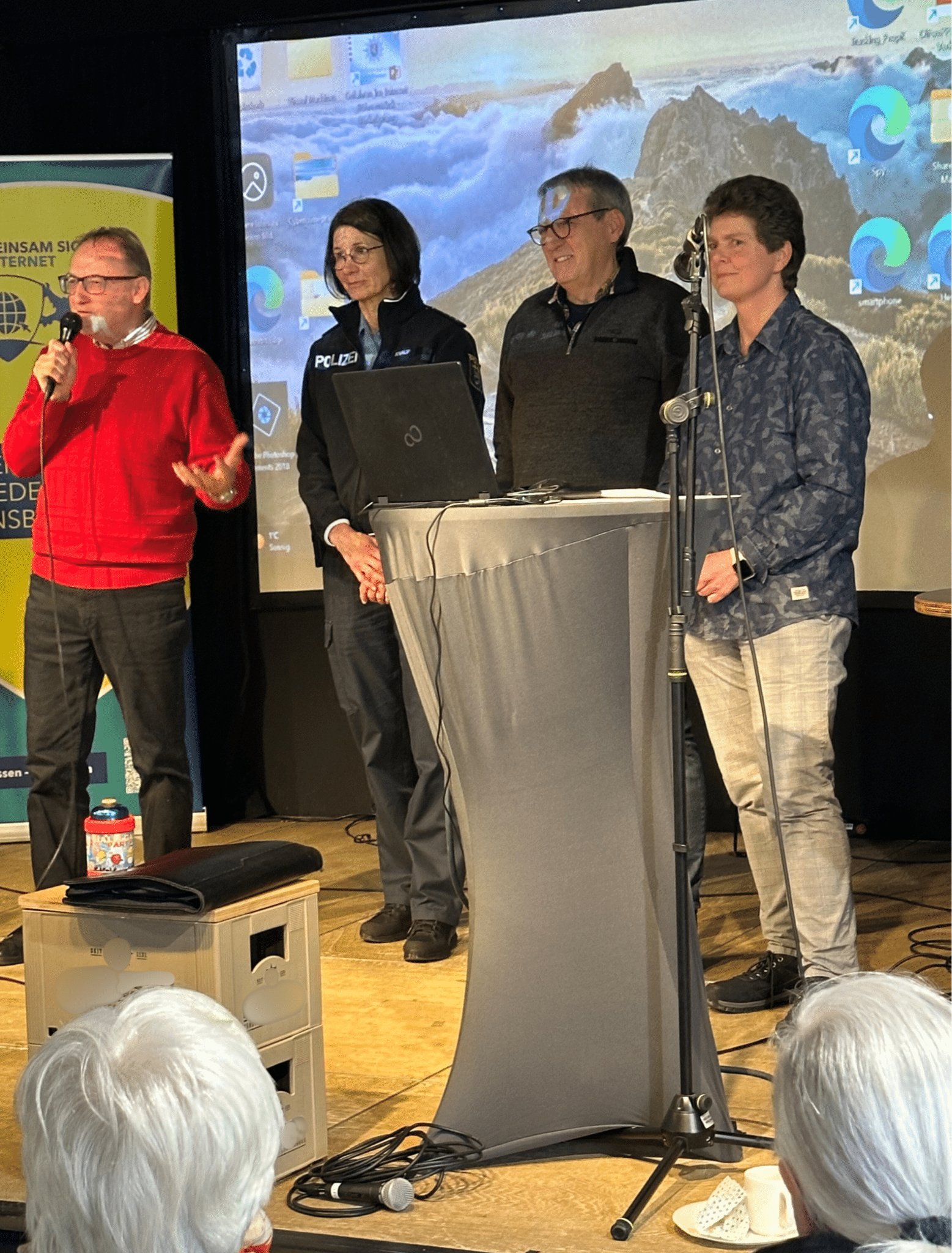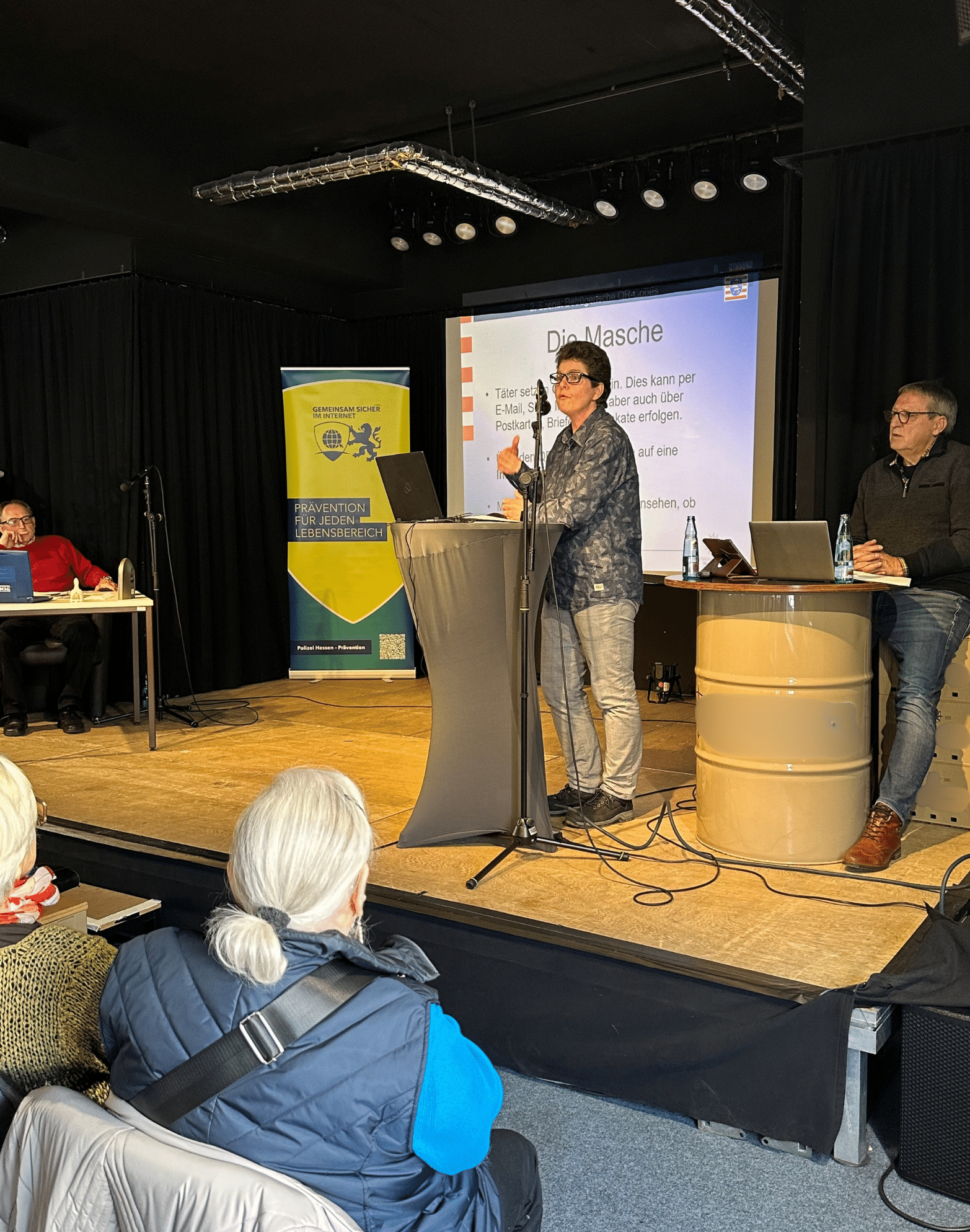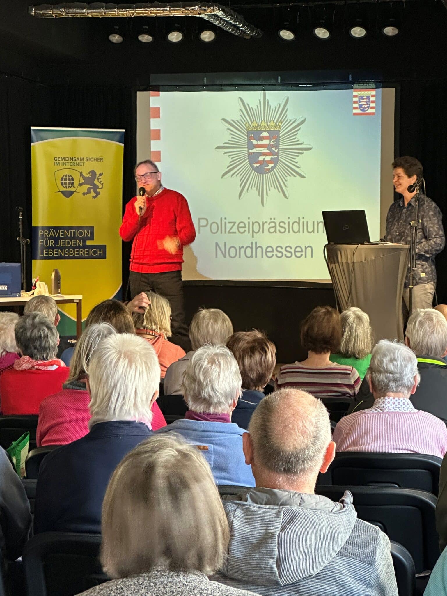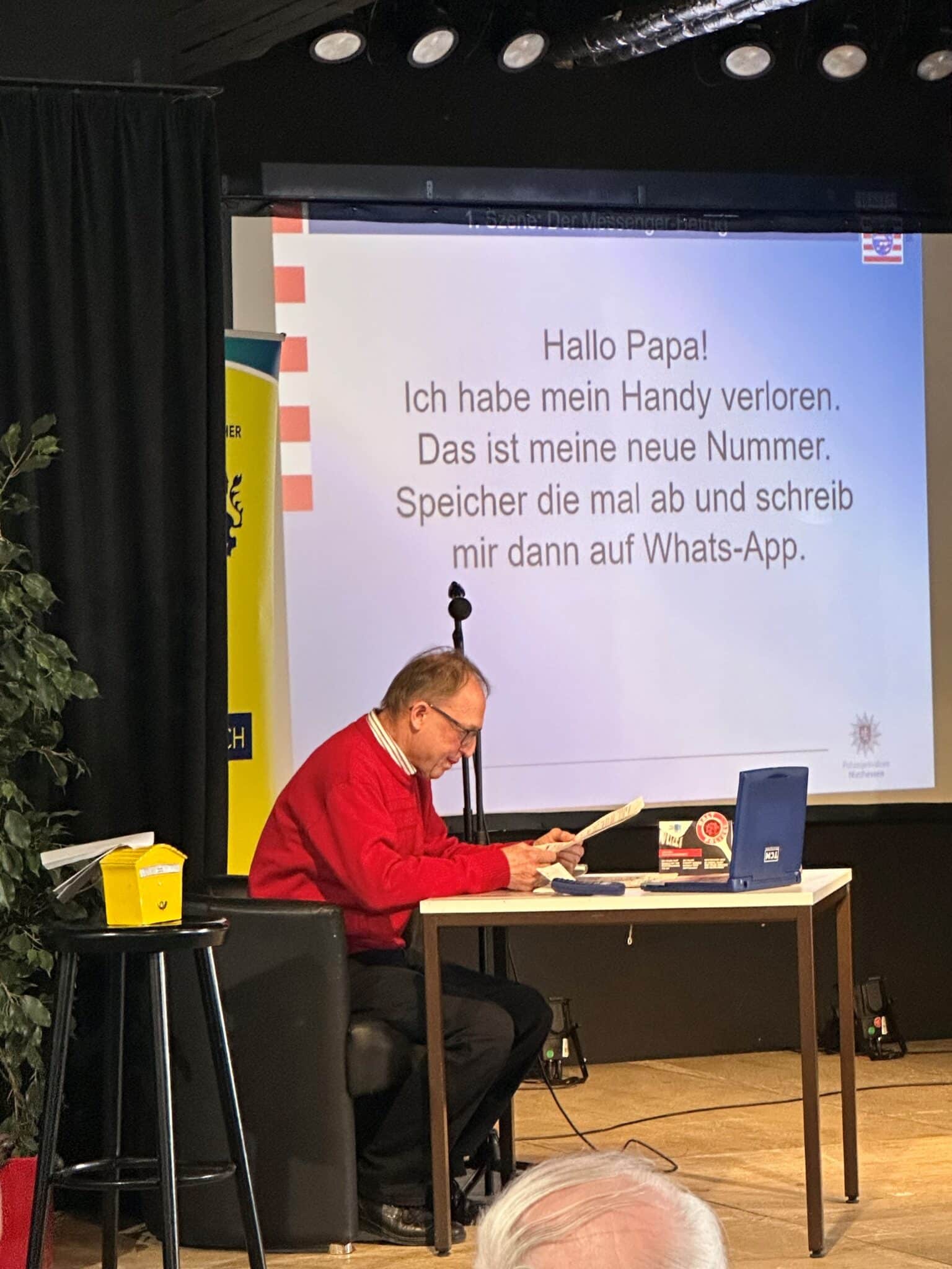 Das Motto der Veranstaltung, die einerseits Ängste und Sorgen bei der Nutzung digitaler Medien abbauen sollte, gleichzeitig aber auch für Gefahren sensibilisieren sollte, wurde in mehreren Abschnitten mit unterschiedlichen Schwerpunkten durch die beiden Wolfhager Seniorensicherheitsbeauftragten Hartmut Vogt und Ralf Meister in Kooperation mit Kriminalhauptkommissarin Aniane Emde (Fachberaterin für Cybercrimeprävention beim Polizeipräsidium Nordhessen) sowie Polizeihauptkommissarin Melanie Knauf (Schutzfrau vor Ort bei der Wolfhager Polizeistation), präsentiert. Alle Themenblöcke, u. a. gefälschte Kurznachrichten, gefährliche Links innerhalb von E-Mails oder auch falsche Bankbenachrichtigungen, wurden zunächst schauspielerisch auf der Bühne nachgestellt, bevor es dann irgendwann hieß „Falle zugeschnappt“. Im Anschluss wurden die Anwesenden darüber aufgeklärt, was sie in dem jeweiligen Fall zur Verhinderung hätten tun müssen und wie sie sich davor schützen können. Es schloss sich jeweils ein Fragenblock an, der sehr gut genutzt wurde und Gelegenheit bot, die Themen noch einmal ausführlich unter sachkundiger Beratung von Kriminalhauptkommissarin Aniane Emde zu diskutieren.