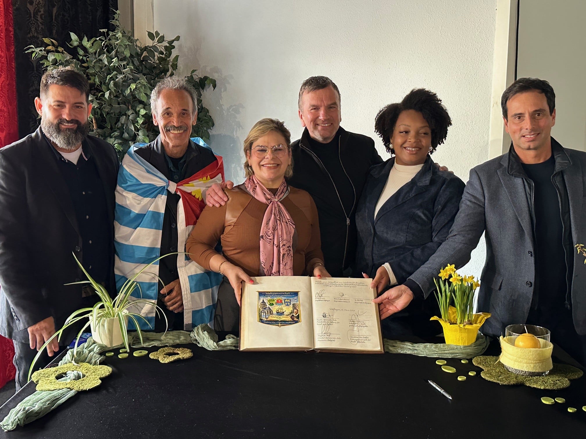 Eintragung ins Goldene Buch der Stadt Wolfhagen. V. l.: Claudinei dos Santos (Bildungsdezernent der Stadt Ubatuba), Charles Madeiros (Initiator des Städtepartnerschaftsprojektes), Flávia Pascoal (Bürgermeisterin von Ubatuba), Bürgermeister Dirk Scharrer, Thaila Aparecida Brito (Präsidentin der Kulturstiftung in Ubatuba), Tiago de Ales (Gründer des Cour des Arts Museum, Belgien)