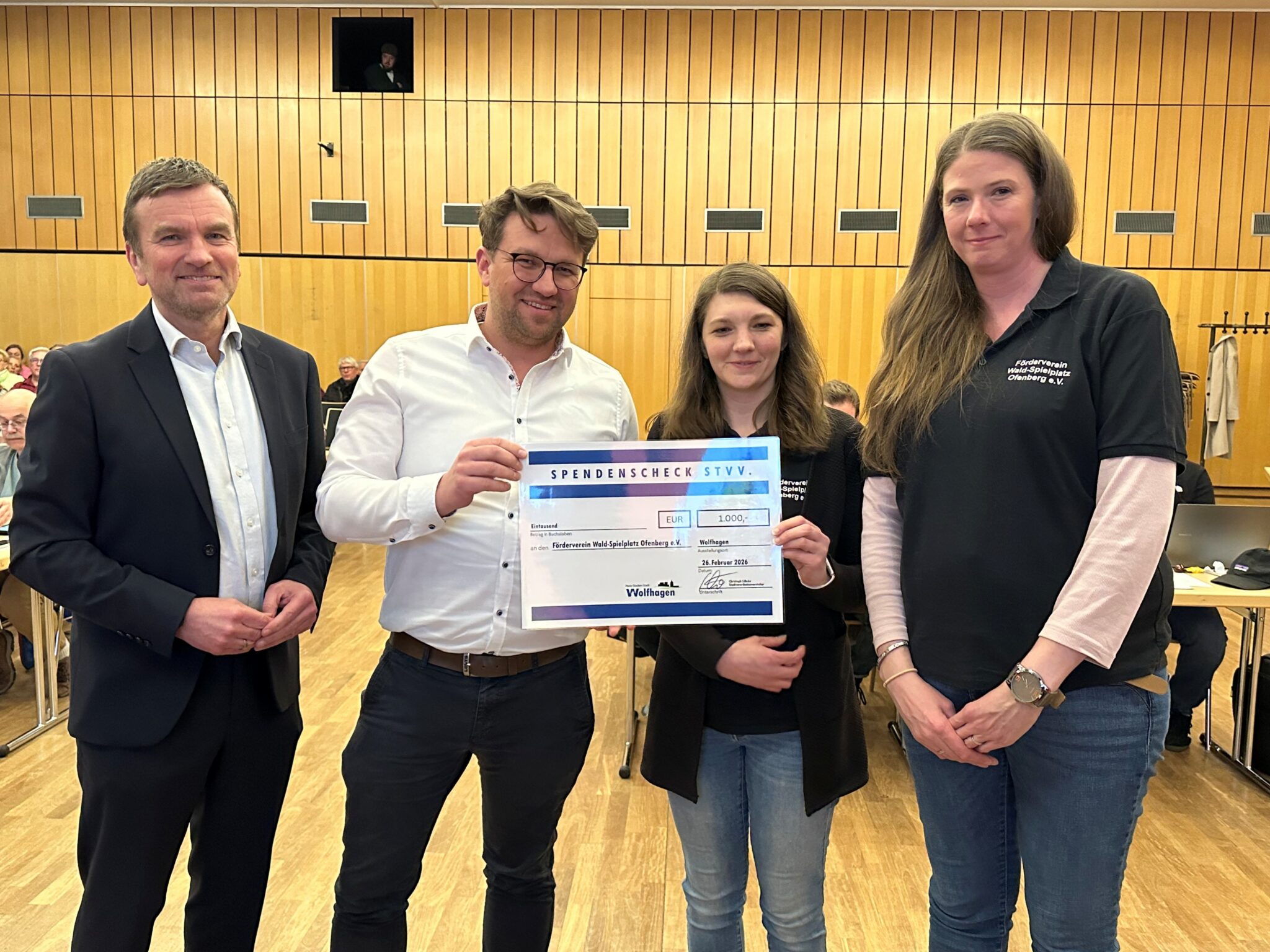 Traditionell spenden die Stadtverordneten der Stadt Wolfhagen die Aufwandsentschädigungen der Dezember-Sitzung der Stadtverordnetenversammlung für eine gemeinnützige Organisation. Im vergangenen Dezember entschieden sie sich dafür, den Förderverein Wald-Spielplatz Ofenberg e. V. zu unterstützen. Zusammengekommen war eine stolze Summe von 960,- €, die von der Stadt auf 1.000,- € aufgerundet wurde. Die Februar-Sitzung wurde nunmehr zum Anlass genommen, die Summe an die beiden Mitglieder des Vorstandes des Fördervereines Anna-Lena Wiegand und Catharina Thust in Form eines symbolischen Scheckes zu überreichen. Selbstredend, dass der Betrag nach Aussage des Fördervereines unmittelbar für eine weitere Attraktivierung des schönen Spielplatzes verwendet wird.