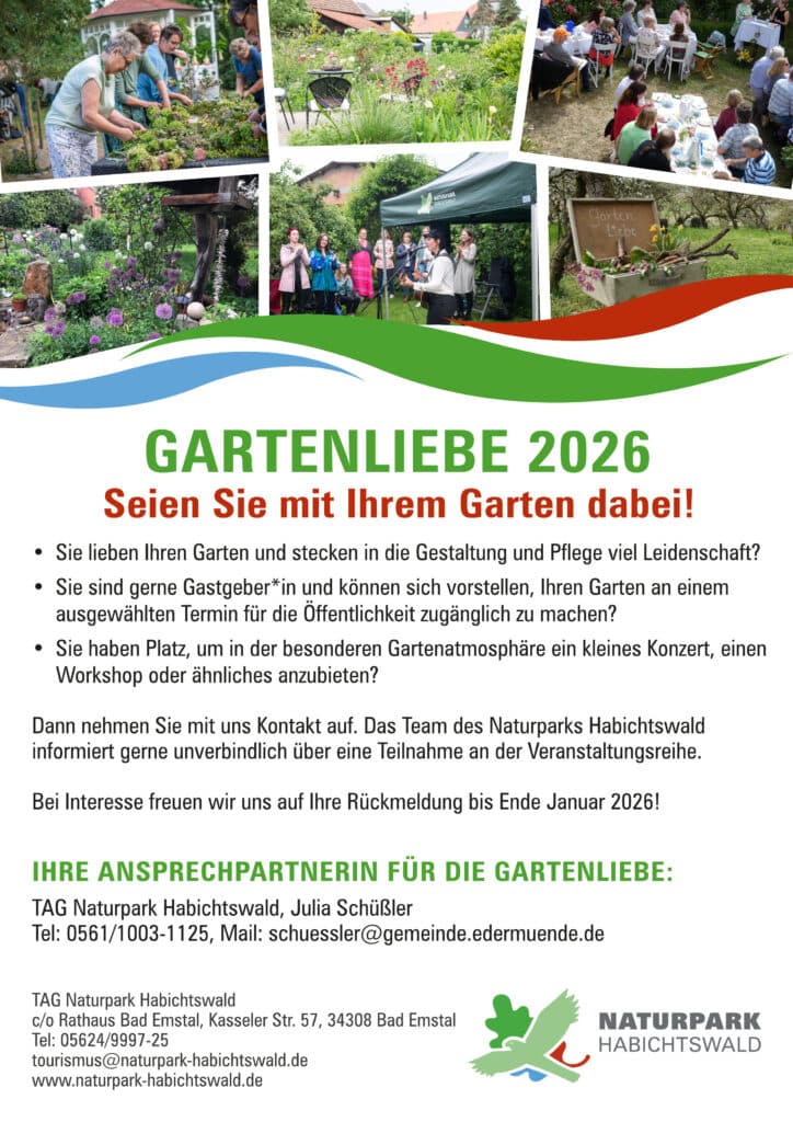 Vor allem die Kombination von offenen Gärten und einem ergänzenden Programm macht den Reiz der GartenLiebe aus - je nach Interesse der Gartenbesitzer werden auch Lesungen, Picknicks, Workshops und Konzerte angeboten. Auch Führungen mit inhaltlichen Schwerpunkt sind möglich. Die Touristische Arbeitsgemeinschaft (TAG Naturpark Habichtswald) unterstützt dabei tatkräftig – von der Ideenfindung, der Vertragsgestaltung über die Werbung bis hin zum Ticketverkauf.