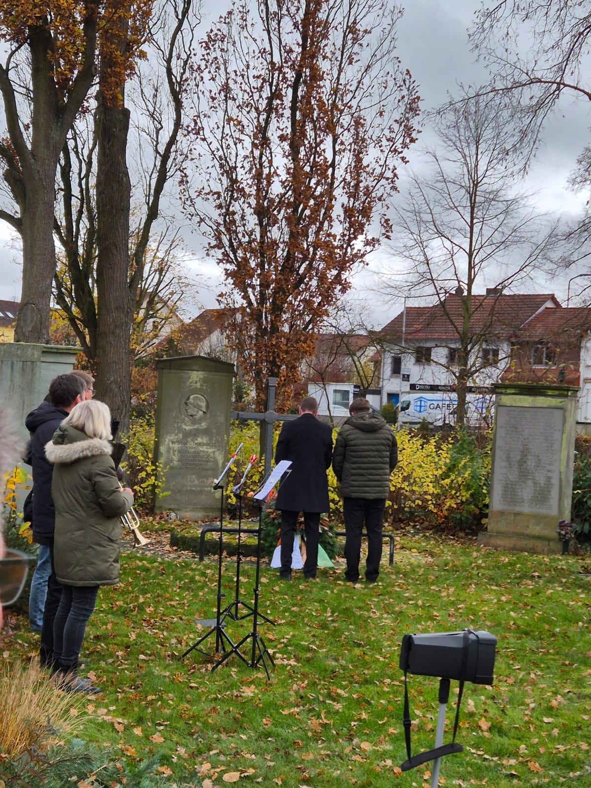 Die Gedenkstunde wurde auf dem Ehrenfriedhof fortgeführt. Der Posaunenchor der evangelischen Kirchengemeinde Wolfhagen sorgte für musikalische Begleitung neben dem Ehrenmal, bevor Bürgermeister Dr. Dirk Scharrer die diesjährige Gedenkrede hielt.