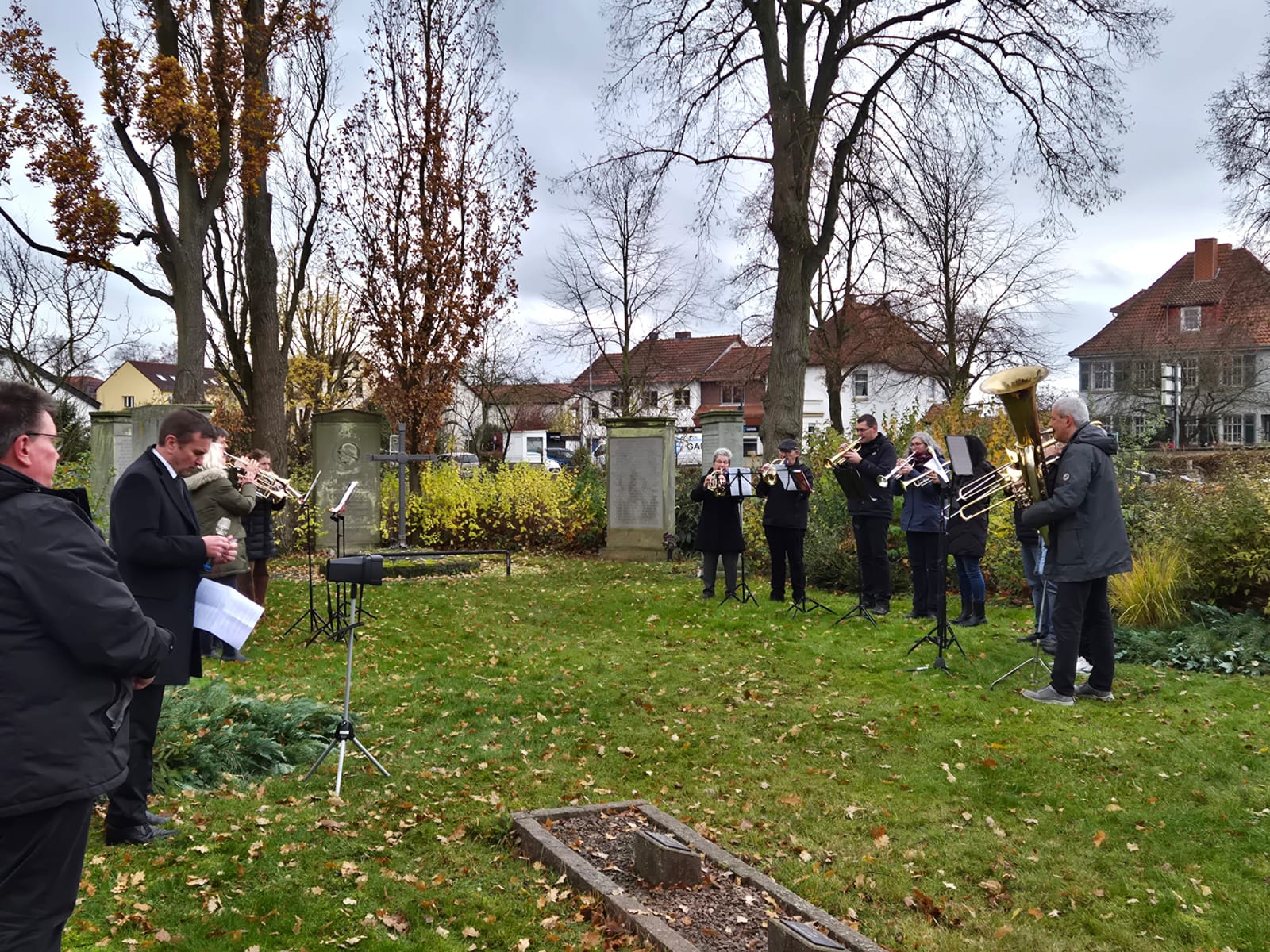 Die Gedenkstunde wurde auf dem Ehrenfriedhof fortgeführt. Der Posaunenchor der evangelischen Kirchengemeinde Wolfhagen sorgte für musikalische Begleitung neben dem Ehrenmal, bevor Bürgermeister Dr. Dirk Scharrer die diesjährige Gedenkrede hielt.