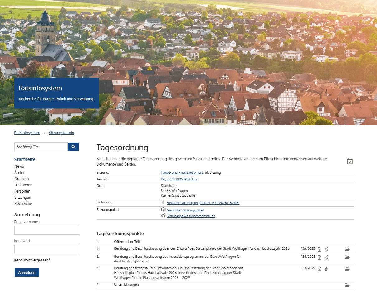 Das Ratsinfosystem ist über die städtische Website erreichbar und steht allen Interessierten kostenfrei zur Verfügung: www.wolfhagen.de/buerger-ratsinfosystem/