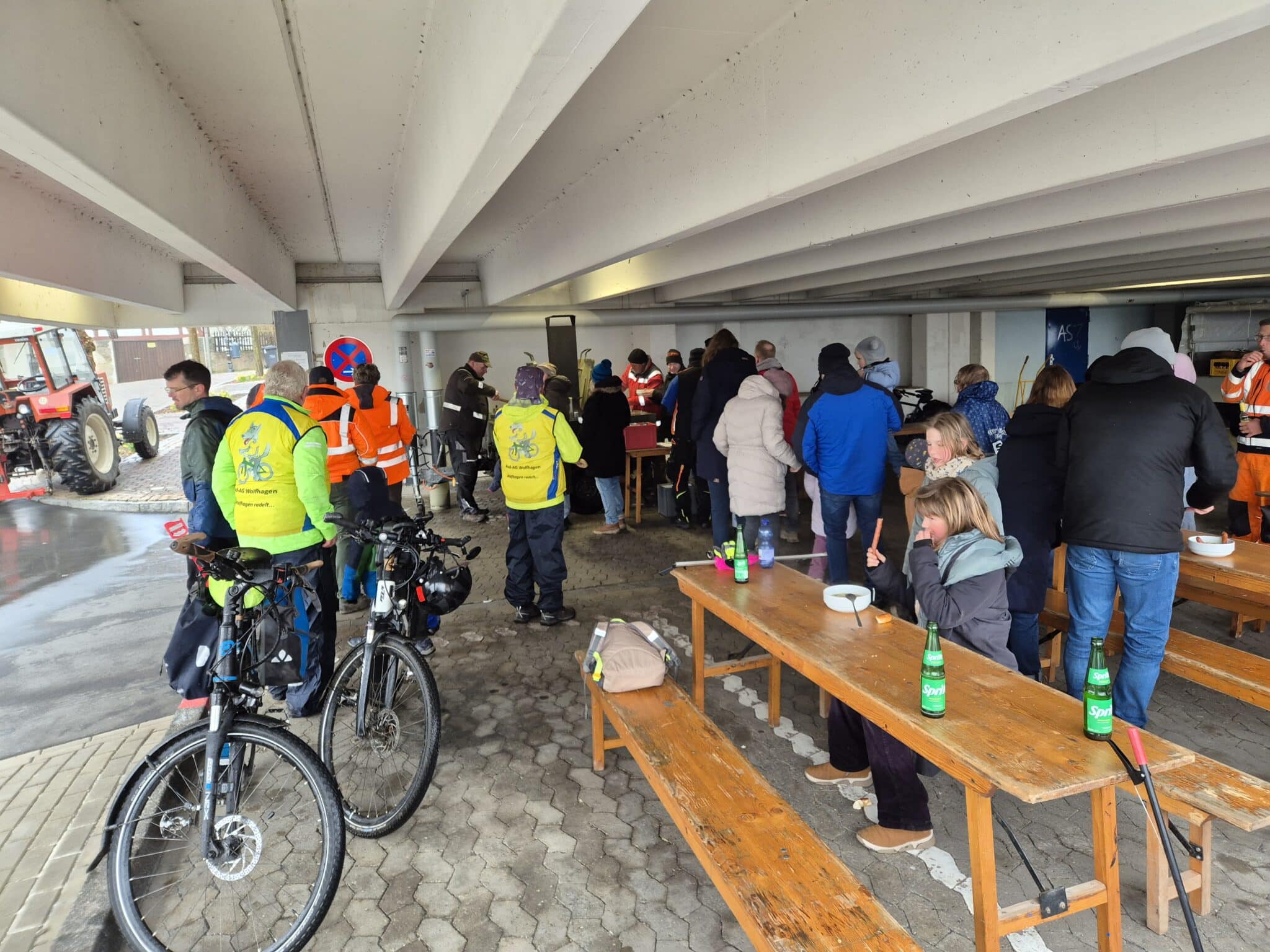 Erstmalig mit dabei war dieses Jahr auch die Rad-AG, deren Radler einige Radwege rund um Wolfhagen nach Müll absuchten und sich am Ende mit allen anderen Engagierten gemeinsam in der Wolfhager Innenstadt zum gemeinsamen Mittagessen einfanden. Die wohlverdiente Stärkung in Form von kostenlosen Getränken und einer warmen Mahlzeit durch Clemens Funk von der Feldküche Nothfelden fand aufgrund des Wetters dieses Mal in der Tiefgarage des Rathauses statt.