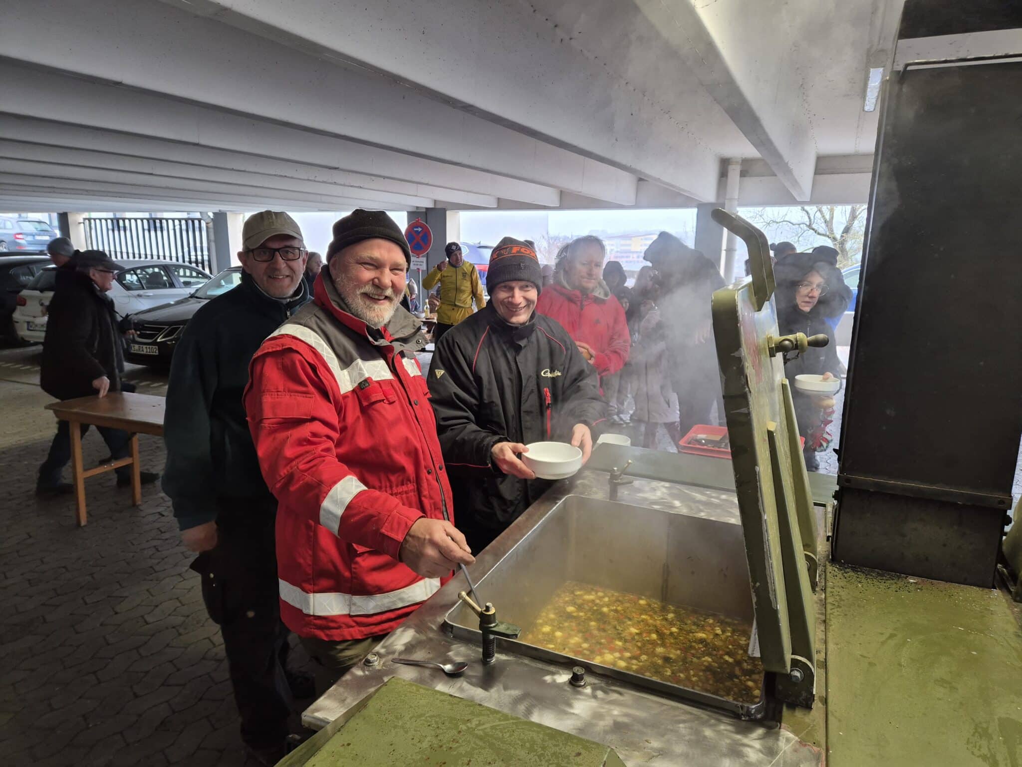 Es gibt Gemüsesuppe mit Würstchen: Clemens Funk (Mitte) von der Feldküche Nothfelden teilt mit Peter Halberstadt (links) und André Lorenz (rechts) das Mittagessen aus.