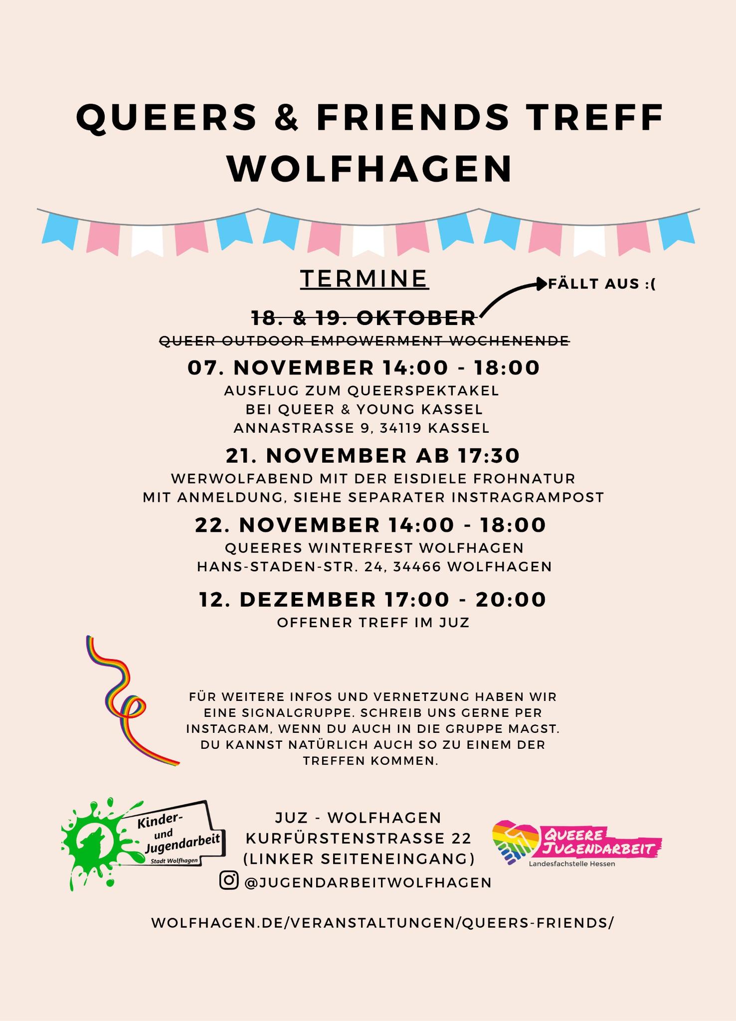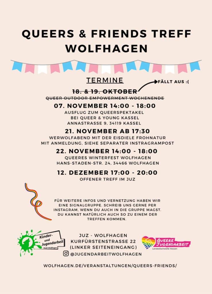 Die Kinder- und Jugendarbeit Wolfhagen widmet sich seit 2022 in Kooperation mit der evangelischen Jugendarbeit Wolfhagen, der LSBTIQ Netzwerkstelle Nordhessen sowie ehrenamtlichen Jugendlichen verschiedenen queeren Projekten.