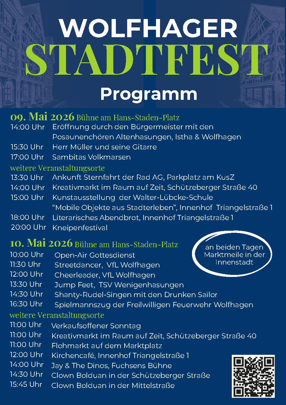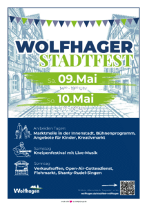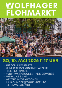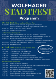 Am 09. und 10. Mai 2026 findet in der Schützeberger Straße und der Mittelstraße zum dritten Mal das Wolfhager Stadtfest statt. Informations- und Verkaufsstände, Imbiss- und Getränkeangebote, fliegende Händler, Kinderkarussells und Mitmachaktionen laden zu einem Erlebnis für die ganze Familie ein.