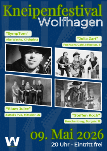 Am Samstag, den 09. Mai, verwandelt sich die Wolfhager Innenstadt wieder in eine musikalische Meile: Beim diesjährigen Kneipenfestival sorgen vier Locations ab 20:00 Uhr für beste Live-Unterhaltung – und das bei freiem Eintritt.