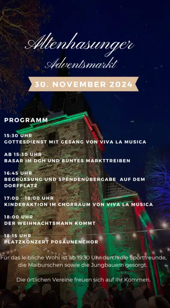 Sie sind hier: Home » Weihnachtsmarkt » Adventsmarkt Altenhasungen