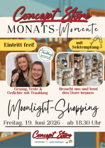 Ein besonderes Highlight erwartet die Besucher im Juni im Concept Store Wolfhagen: Am 19. Juni 2026 lädt das Team zum sechsten „Monats-Moment“ des Jahres unter dem Motto: "Moonlightshopping" ein.