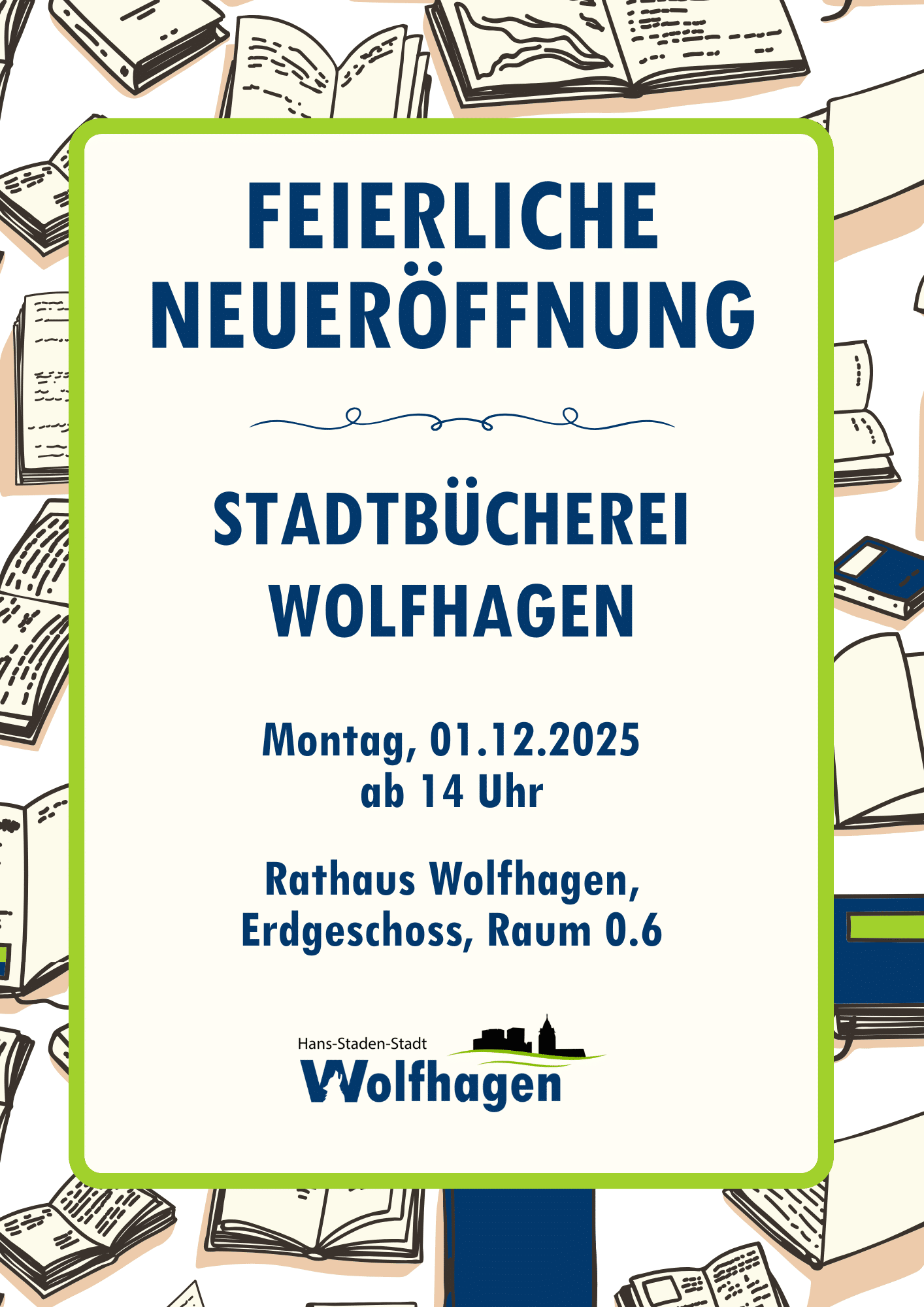 Am Montag, den 1. Dezember 2025, öffnet die Stadtbücherei Wolfhagen an ihrem neuen Standort im Rathaus offiziell wieder ihre Türen. Nach vielen Jahren im Alten Rathaus, in dessen Räumlichkeiten inzwischen die Schachfreunde Wolfhagen e.V. eingezogen sind, ist die Bücherei nun im Erdgeschoss des Rathauses, Raum 0.6, zu finden. Der Umzug wurde im November erfolgreich abgeschlossen.